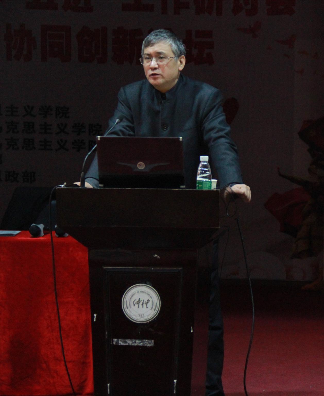 在研讨会中,程美东教授就“高校如何贯彻十九大精神”作第一阶段主题报告。程美东在报告中介绍了习近平同志与中国梦的提出,贯彻中国梦的政治意义与战略意义,介绍了党的十八大以来五年的历史成就与定位,强调思政课要在党委的领导和老师的努力下作改变,把“八个方略”、“习近平新时代中国特色社会主义思想”、“四个伟大”等新概念、新提法、新论断放进课堂去。