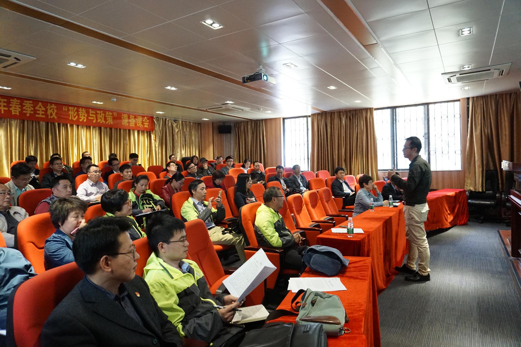 为深入学习贯彻党的十九大精神和2018年全国两会精神,提升“形势与政策”课质量和水平,根据《中共中央办公厅、国务院办公厅关于进一步加强和改进新形势下高校宣传思想工作的意见》和《广东省教育厅关于做好2018年春季高校党委书记、校长和院(系)党委书记、院长(系主任)上第一堂思想政治理论课工作的通知》(粤教思函[2018]15号)要求,4月8日下午,我校召开了2018年春季全校“形势与政策”课备课会。会议由学校党委副书记向梅梅主持,各二级学院党总支书记、院长,今年会官网全体教师和“形势与政策”课兼职教师参加了会议。
