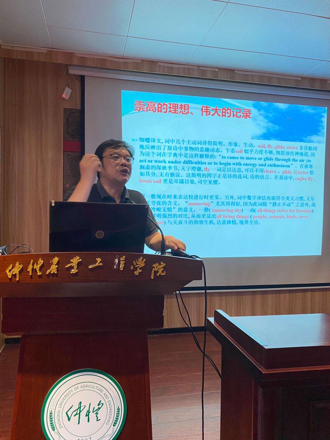 会议邀请学校宣讲团成员、外国语学院院长李磊教授作了题为《崇高的理想,伟大的记录——毛泽东诗词鉴赏与翻译研究》的专题辅导报告。会议上,李磊教授首先朗诵了写于1925年的《沁园春·长沙》——“看万山红遍,层林尽染;漫江碧透,百舸争流。鹰击长空,鱼翔浅底,万类霜天竞自由”,李磊教授慷慨激昂、饱含激情的朗诵,一下子将教职工们带入毛主席的诗词境界之中。紧接着,通过对诗词内容的层层解读,李磊教授引导大家进一步感受作者博大的胸怀、火热的革命情怀。从大革命低潮时期的“烟雨莽苍苍,龟蛇锁大江”,到红军历尽艰辛翻过雪山后的“更细岷山千里雪,三军过后尽开颜”,通过对《沁园春·长沙》、《菩萨蛮·黄鹤楼》、《十六字令·山》、《忆秦娥·娄山关》等七首诗词深入浅出、中西结合的讲解,李磊教授为我们展现出一幅中国革命发展历程的画卷。通过对诗词的解读以及独到的翻译过程,配合李磊教授抑扬顿挫、铿锵有力的朗诵,与会人员进一步感受到毛泽东诗词中所包含的博大情怀,重温了红军不怕困难,勇敢顽强的革命精神。李磊教授的专题辅导报告主题突出、素材鲜活,更给人以美的享受,给与会人员上了一场生动的党史学习教育课。