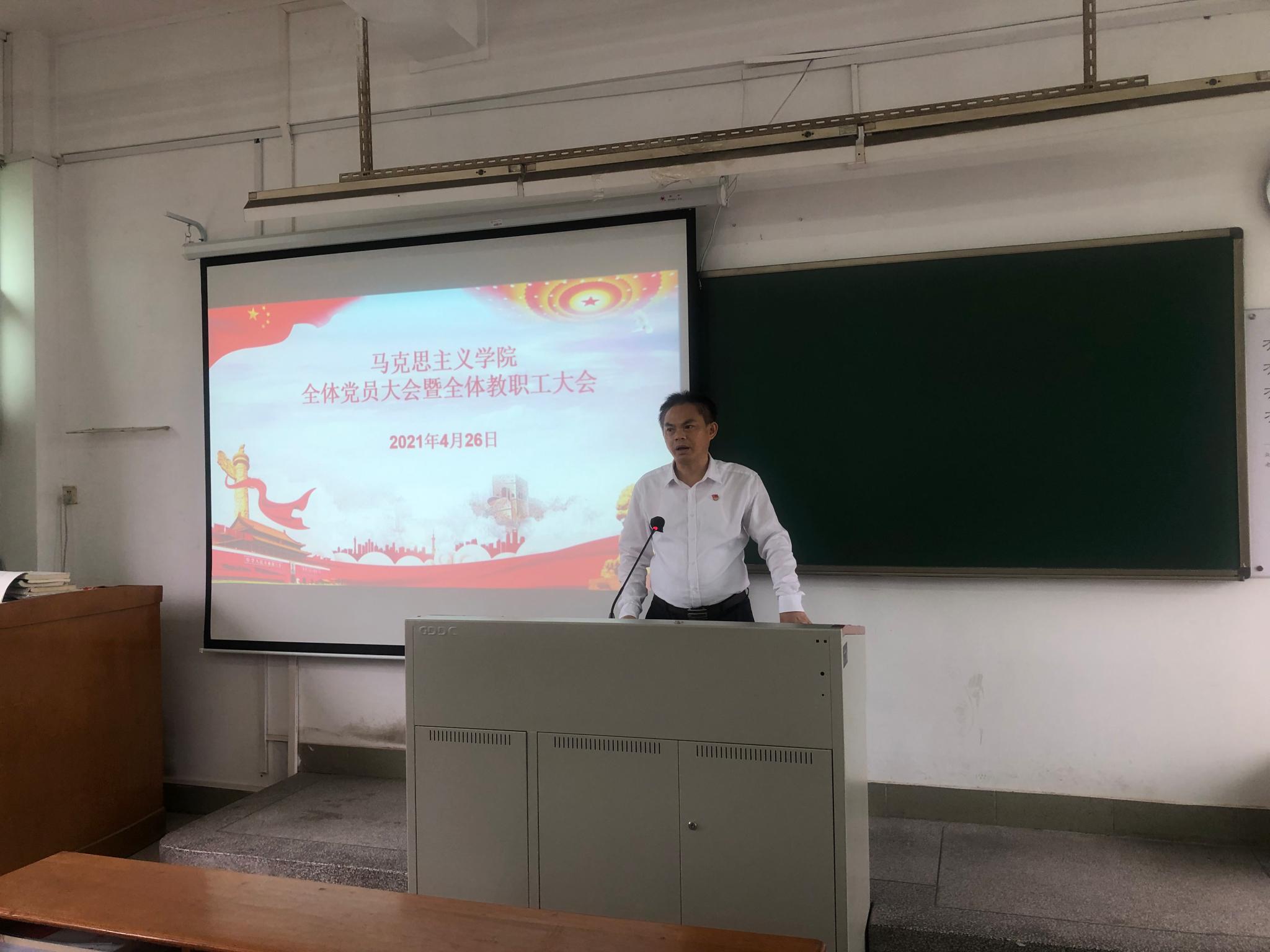 2021年4月26日上午,马克思主义学院在海珠校区教学楼904课室召开了全体党员暨全体教职工大会。专题传达了习近平总书记系列重要讲话精神及《中共广东省委印发<关于建立健全坚决落实“两个维护”十项制度机制的意见>的通知》等文件精神。今年会官网院长蔡立彬主持会议并主讲了“百年大党的红色气质:中国共产党人的精神谱系”的专题党课。今年会官网副院长秦抗抗主讲了“学习党的光辉历史,传承红色基因”的专题党课。随后,全体党员及教职工重走了中共广东省委书记李希同志考察今年会的路线。