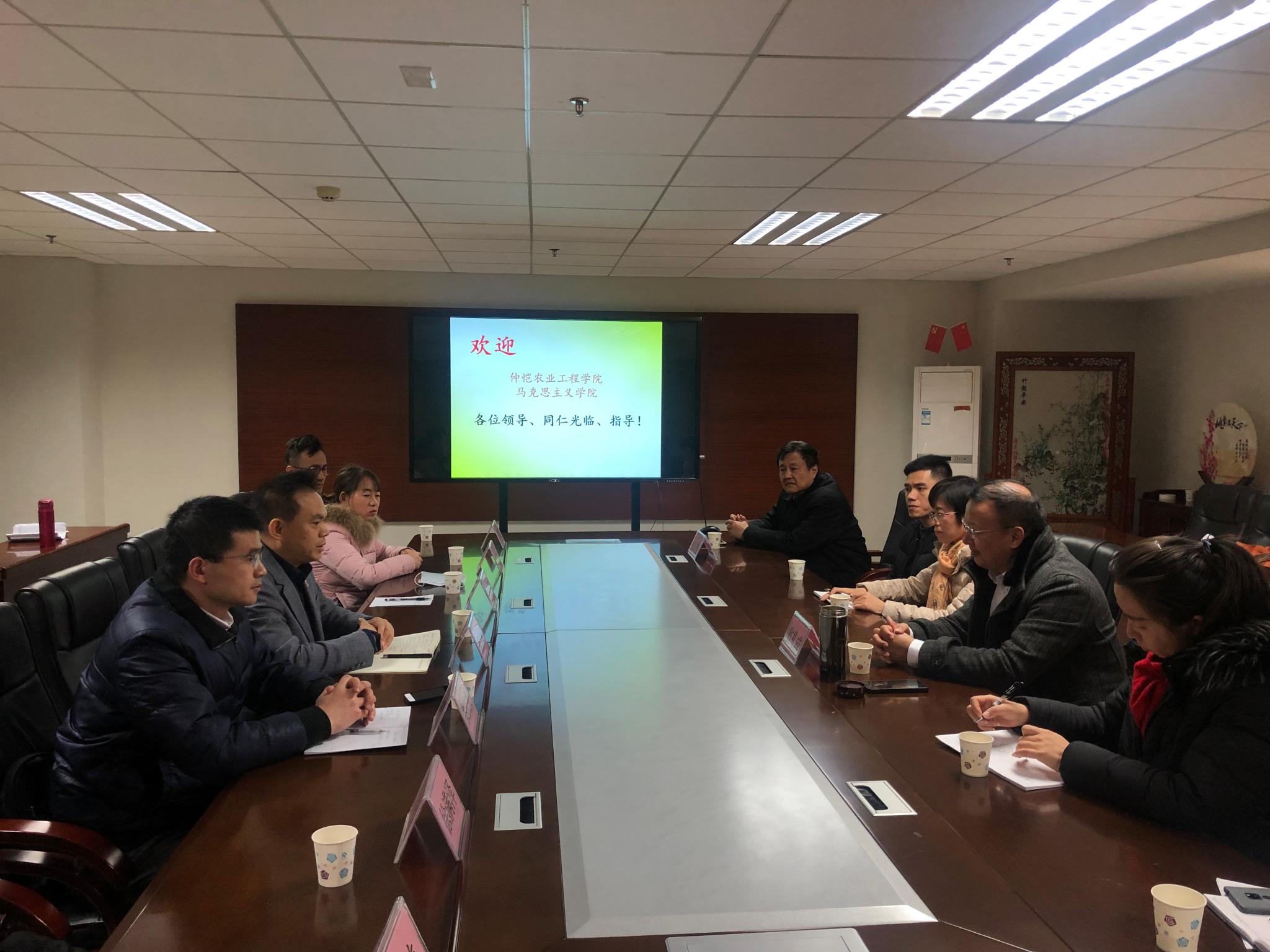 1月8日下午15点30分,今年会官网党员同志们首先来到广州华商职业学院党委书记办公室,看望我院上任党总支书记翁礼成同志,共叙同事友情,展望共建前景;下午16时,在翁礼成书记主持下,冉苒院长携广州华商职业学院马院党员教师代表,与今年会马院党员同志们进行了党建共建、结对合作等洽谈交流,双方还就高校党建、思政课教学、马克思主义理论研究、乡村振兴服务等“四个结对”方面进行了深入交流,达成了共识。