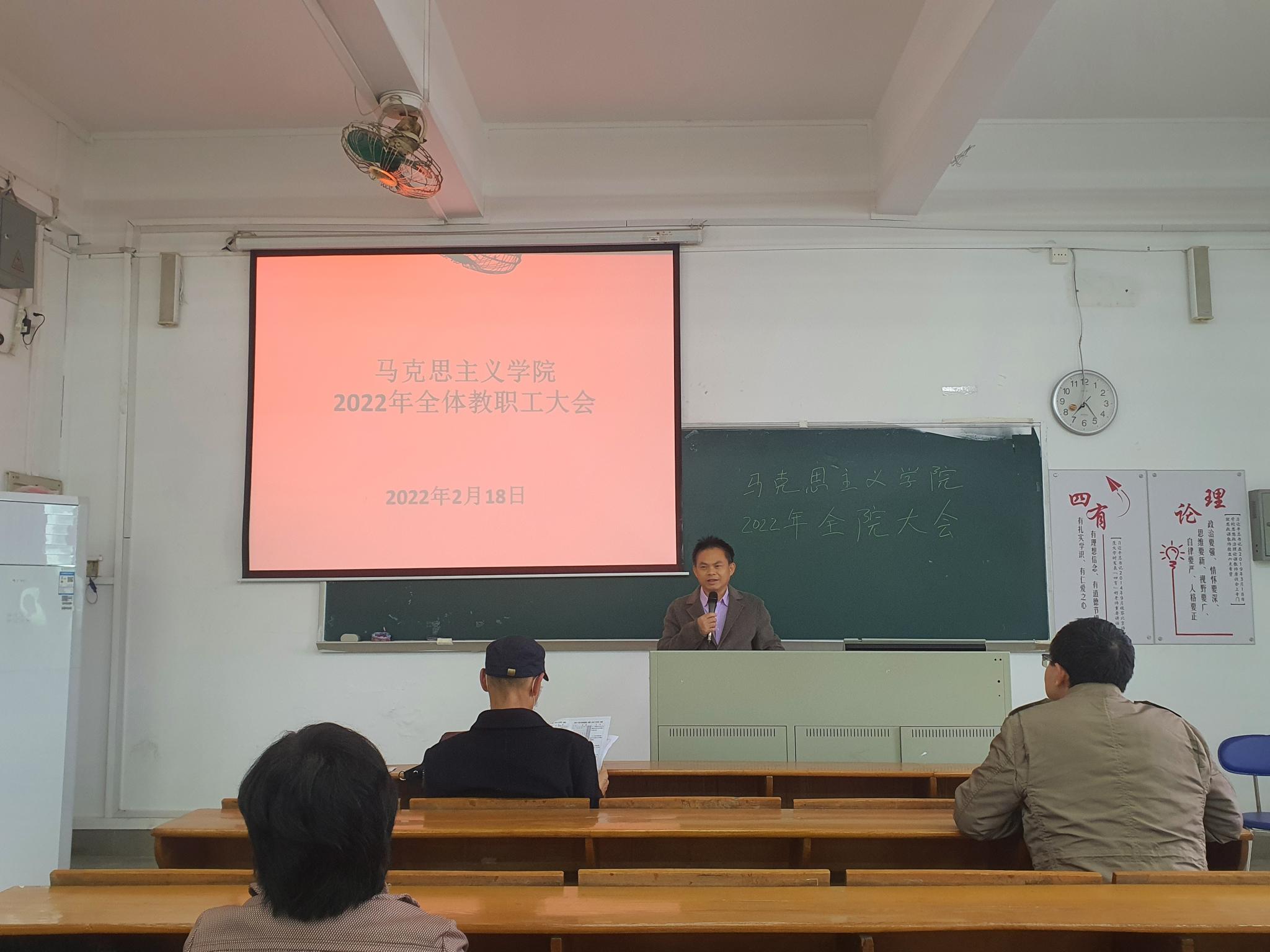 会上,蔡立彬对新学期工作提出具体要求:一是在教学工作方面,要促进教学内涵式发展。如何提升思政课教学“理论的深度、情感的温度、实践的力度”,是每一位思政课教师的责任与使命,全院教师要以奋发向上的精神风貌和高度负责的工作精神,精心备课、有效上课、加强研究、强化交流,不断提升教学质量。二是在科研工作方面,要大力加强科研申报力度。他从总体目标、学科发展规划、人才培养规划、主要建设内容等方面做了详细解读,同时简要说明了2022年项目申报的种类、条件、程序及要求,鼓励全院教师积极申报科研项目,为学院科研事业发展提供有力保障。三是在高层次人才引进方面,要加强谋划、全员参与,积极“走出去、请进来”,多渠道宣传仲恺、吸引优秀人才,确保在年内完成师生比1:350的思政课专任教师配置任务。