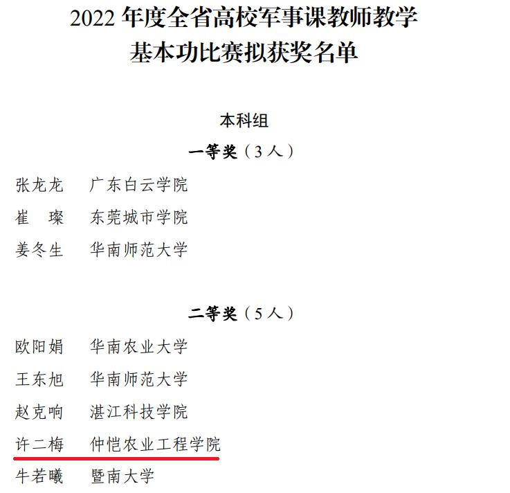 2022年12月29日,广东省教育厅在官网上公示了2022年度全省高校军事课教师教学基本功比赛拟获奖名单。根据广东省教育厅、广东省军区战备建设局《关于举办2022年度全省高校军事课教师教学基本功比赛的通知》要求,今年会官网积极组织专兼职“军事理论”课教师备战比赛,经过校内初赛、专家点评、学校审核等环节,许二梅副教授以全校第一名的成绩被推荐参加省赛的复赛和决赛。