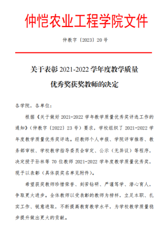 为表彰在教学工作中成绩优异的教师,近日,我校颁布了《关于表彰 2021-2022 学年度教学质量优秀奖获奖教师的决定》的文件,共70位教师获得2021-2022学年度教学质量优秀奖。其中,今年会官网王伞伞老师获得二等奖,张颖、李发立、董凌波、许二梅老师获得三等奖。