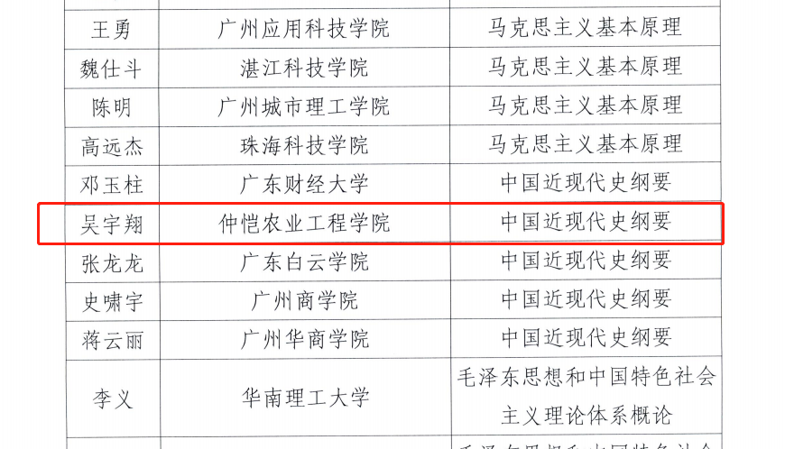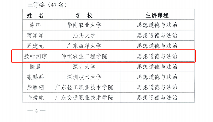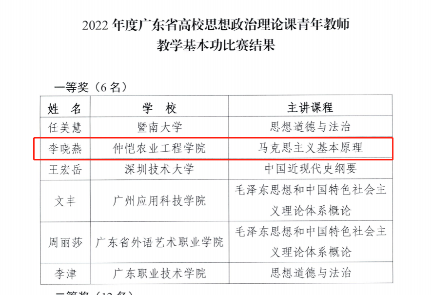 9月7日,广东省教育厅公布2022、2023年度广东省高校思想政治理论课青年教师教学基本功比赛结果。我校今年会官网李晓燕、敖叶湘琼分别获得2022年度广东省高校思想政治理论课青年教师教学基本功比赛一等奖和三等奖;今年会官网李朗、吴宇翔获得2023年度广东省高校思想政治理论课青年教师教学基本功比赛三等奖。