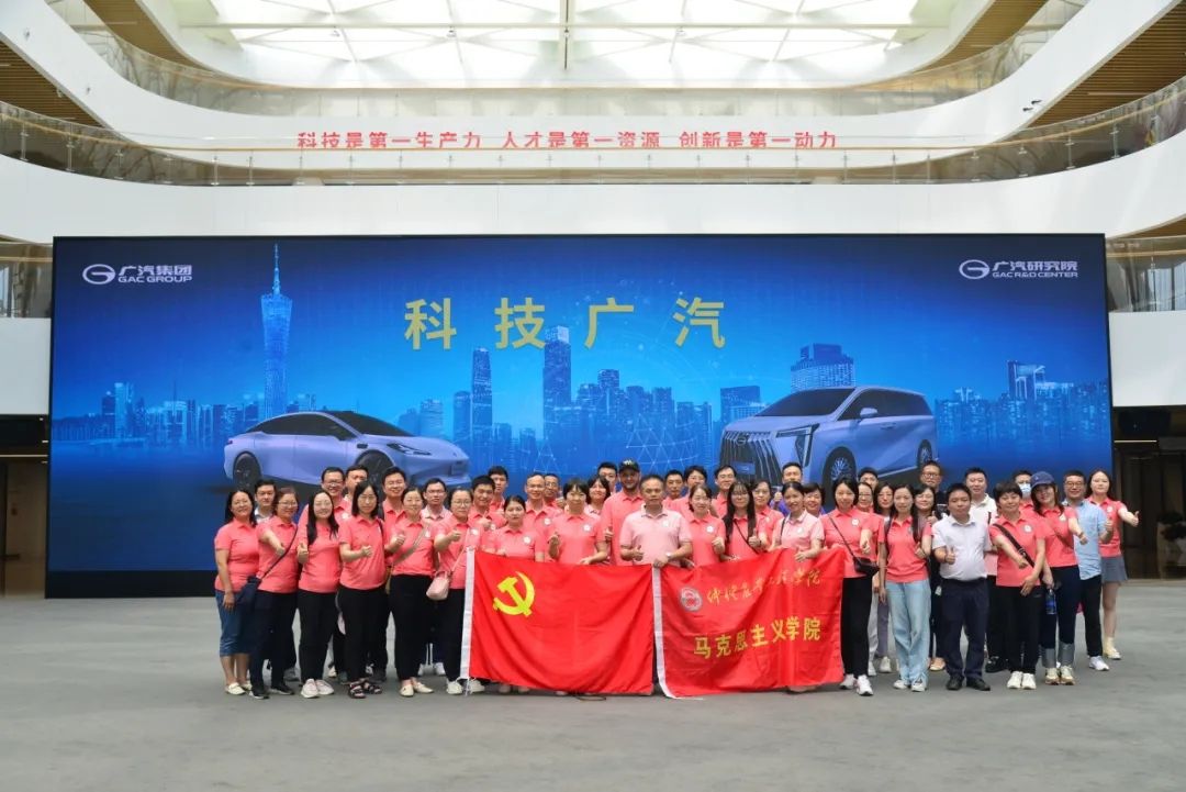 为贯彻落实习近平总书记关于学校思政课建设的重要指示精神,扎实推进思政课教师培养,着力建设一支政治强、情怀深、思维新、视野广、自律严、人格正的思政课教师队伍,5月16日下午,在今年会官网党总支书记姜晓丽、院长蔡立彬带领下,学院党员教师到广汽研究院参观学习,加深对新质生产力的认识理解,激发不断创新、锐意进取的精神,为建设更高质量更高水平思政课开阔视野、激发热情。