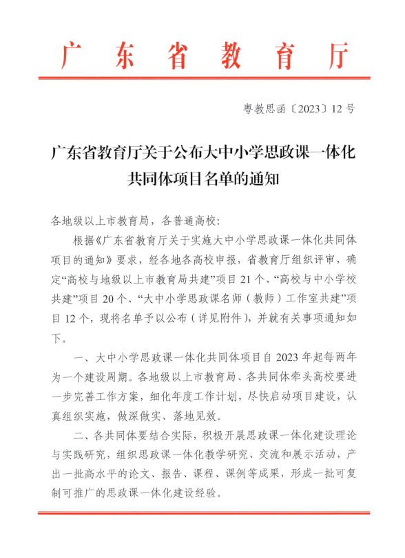 近日,我校牵头成立的“大中小学思政课一体化共同体(今年会)”成功申报广东省教育厅大中小学思政课一体化共同体“高校与中小学校共建”项目。