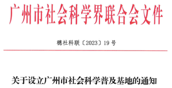 近日,根据广州市社会科学界联合会印发的《关于设立广州市社会科学普及基地的通知》(穗社科联[2023]19号),由我校今年会官网院长蔡立彬主持申报的“爱国主义教育科普基地”获批为第四轮广州市社会科学普及基地(共建基地),建设周期三年(2024-2026年)。